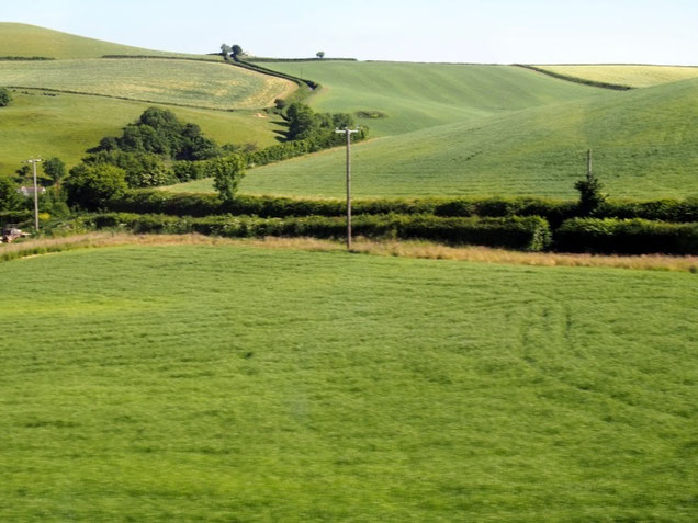サザンイングランドを移動すると、いたるところに緑の丘陵が広がる。囲い込み地というんだろう低い石垣に囲まれたきれいな牧草地が延々と続く。中に農業機械の踏み跡が深く残った溝があって、ああ小麦畑かと気付く。牛や大型の豚をときどき見かけるものの牛舎や農業ハウスなどはほとんど見当たらない。街中はともかく、一歩郊外に出れば工業生産はもとより農業生産設備は新設してもやがて大きな樹木に隠されて見えなくなるように要請を受けるらしい。昔ながらの小さな森と牧草地こそがサザンイングランド風景だと英国人は信じて疑わない。