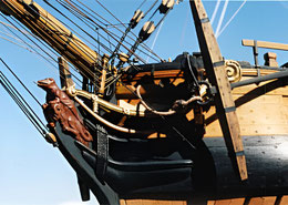写真ではわからないが、マストのフォアステイ(正確にはファルスステイ:補助ステイ、ステイとは前支索)はなんと鎖である。これも臼砲の衝撃を考慮してか、あるいは臼砲の火炎を考慮してか、この鎖も縮尺に合わせて真鍮線で作った。その他の細部は写真を参照ください。